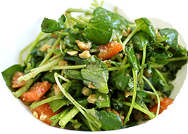 - ❶(葉はトッピング用に少し取っておく)、サーモンのおさしみ、しょうゆ、ごま油、レモン汁を和え、器に盛り付け、ホワイトセロリの葉をトッピングする。