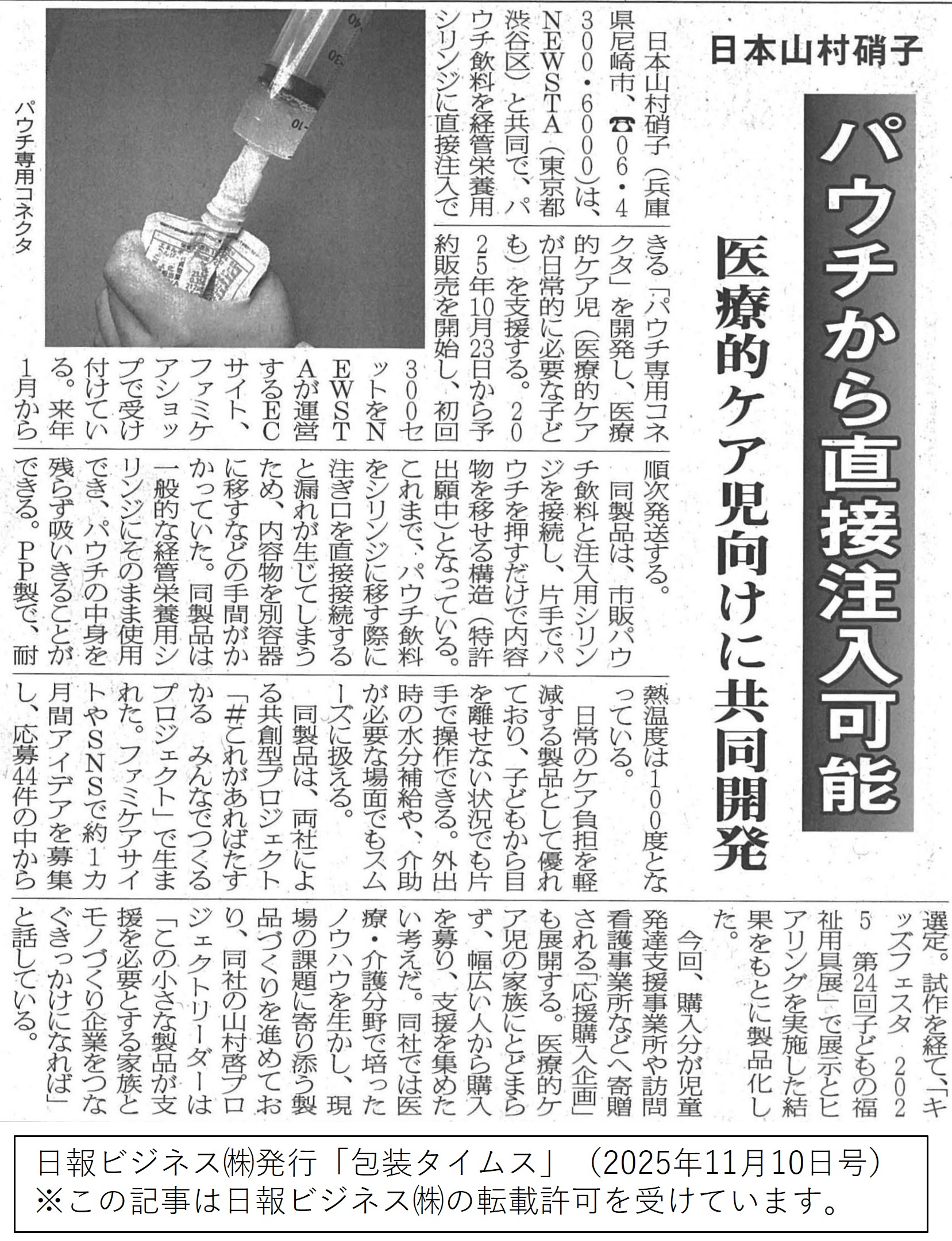 2025年10月23日(金)に公表した『【日本山村硝子×ファミケア】 全国の疾患児・障がい児家族と共に開発した医療的ケア児向け新製品 「パウチ専用コネクタ」』について「包装タイムス(2025年11月10日号)」に掲載されました。