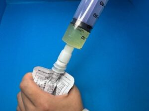 市販のパウチ飲料と注入用シリンジを直接つなぎ、片手でパウチを押すだけでスムーズにシリンジへと内容物を移せるコネクタ(特許出願中)。